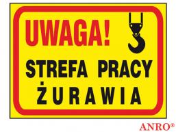 Tablica budowlana „Uwaga! Strefa pracy żurawia”.