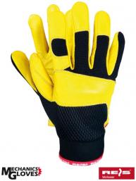 Rękawice ochronne wykonane z wysokiej jakości skóry koziej połączonej z tkaniną.